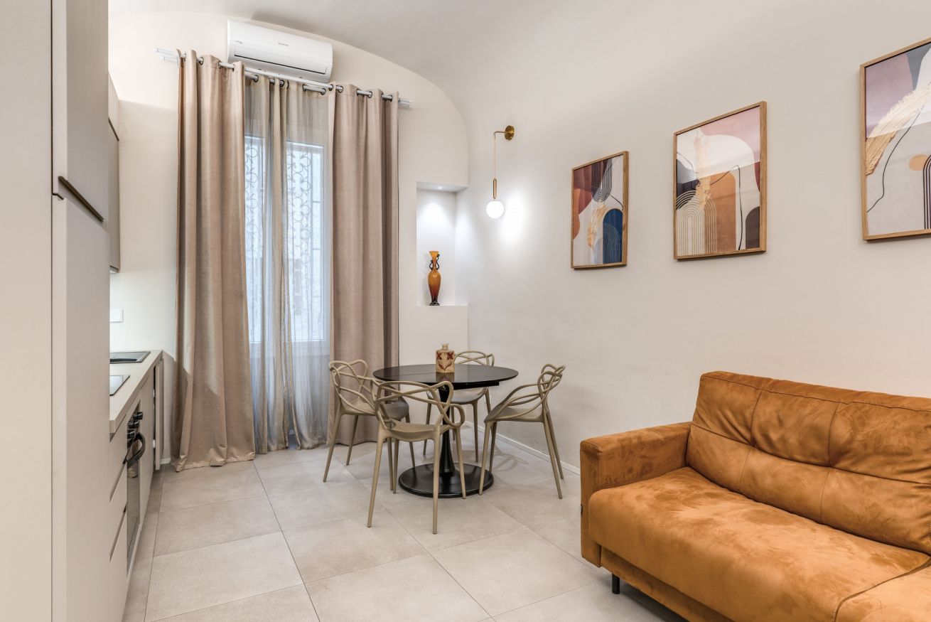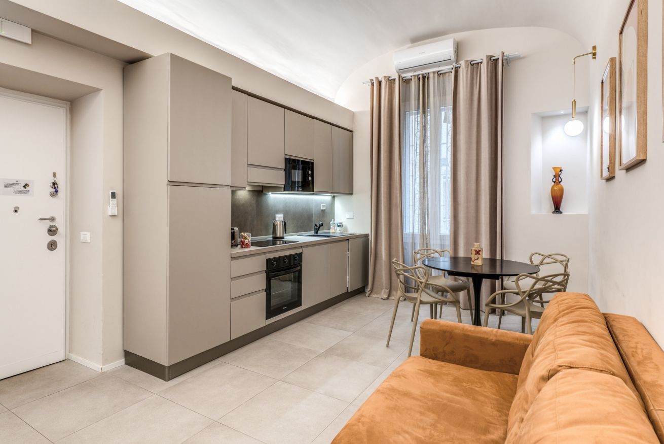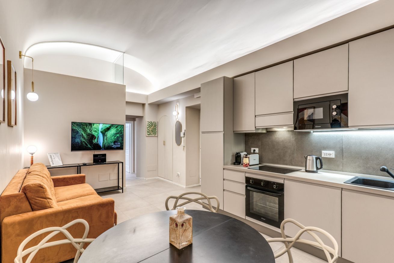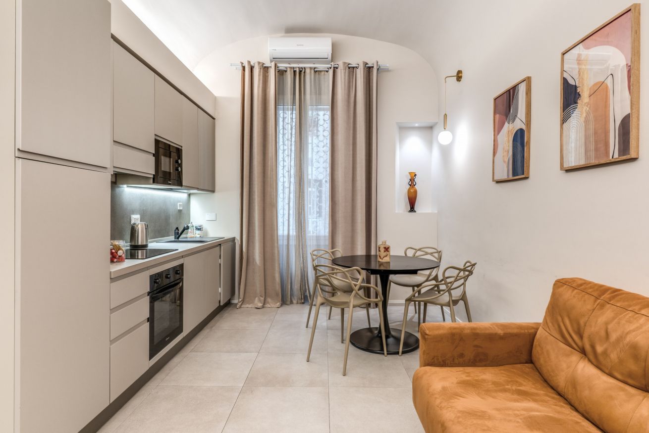 Una zona living con divano e cucina attrezzata completa questo appartamento, dotato di tutti i comfort e ideale per coppie, famiglie, gruppi di amici e reso unico dalla sua posizione strategica e servita da tutti i mezzi pubblici.