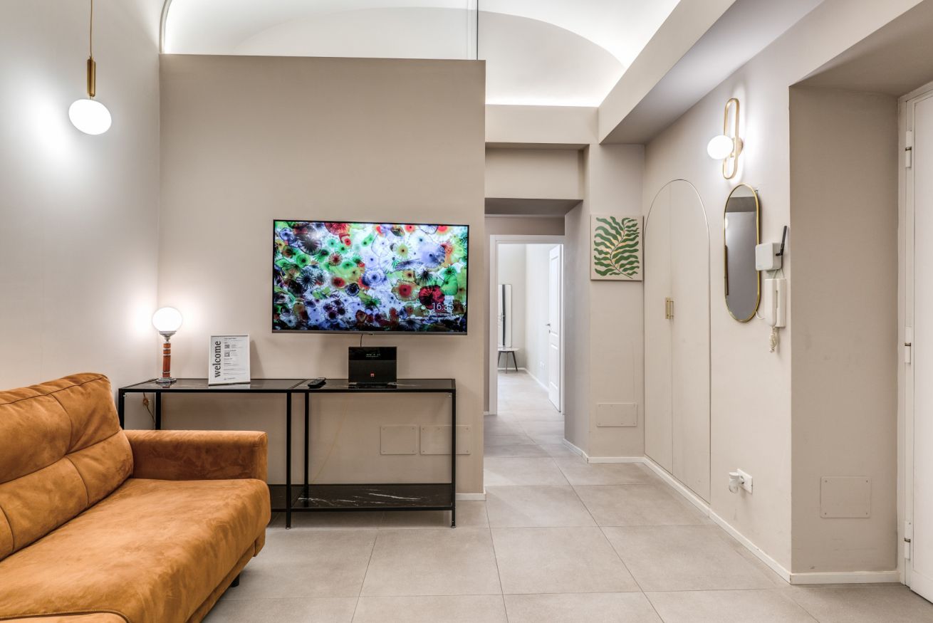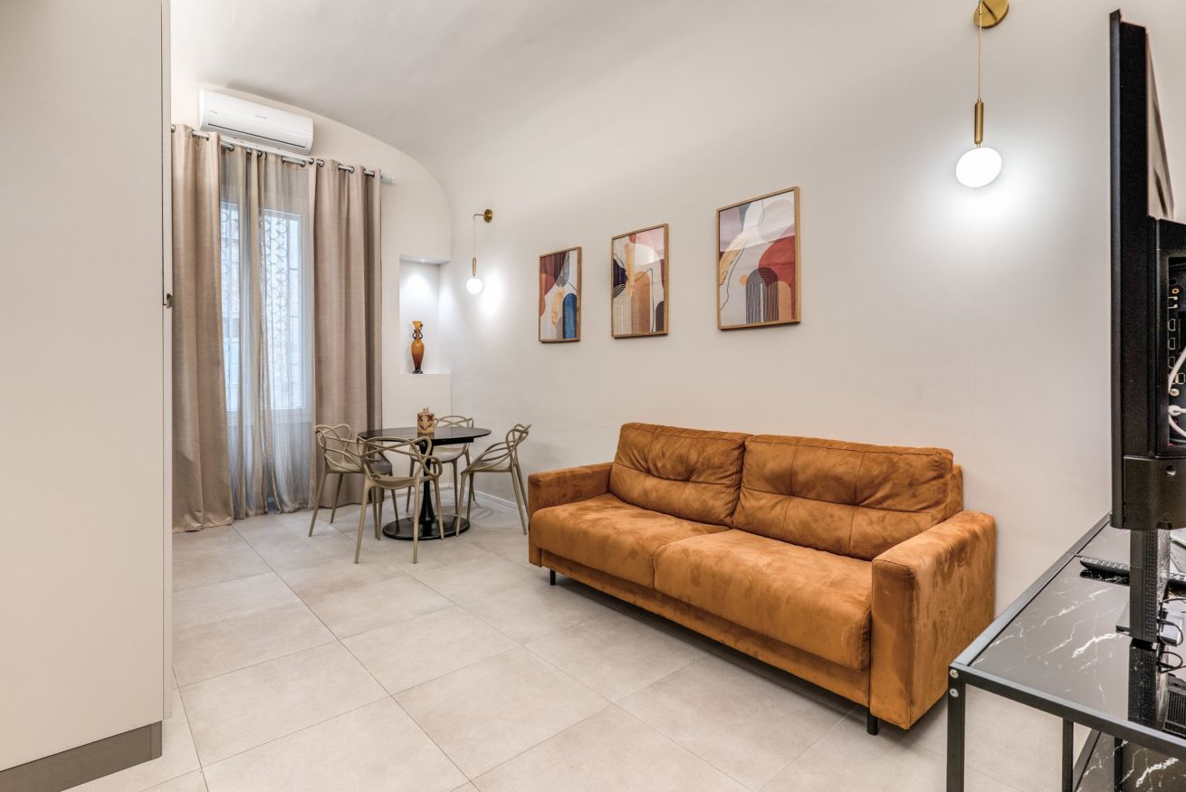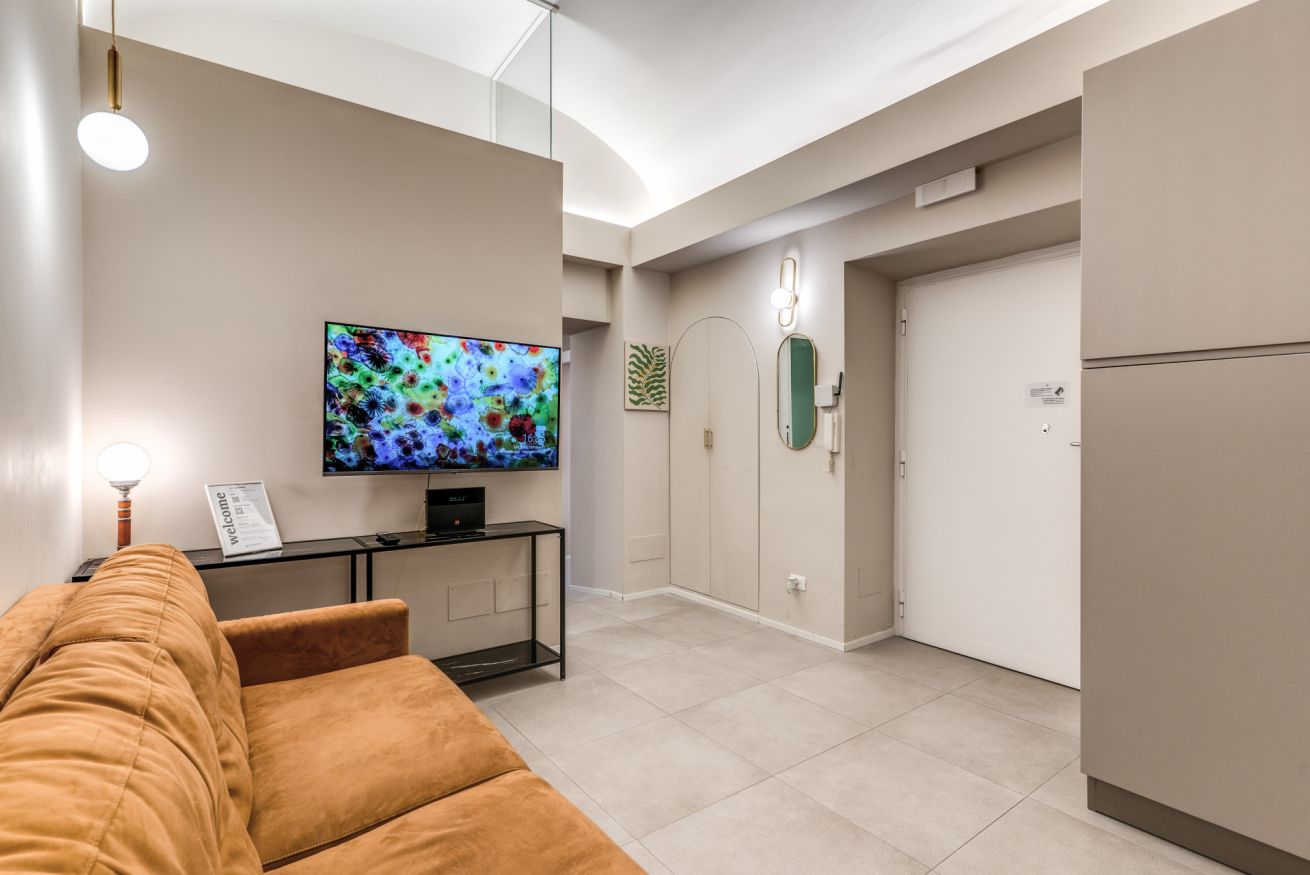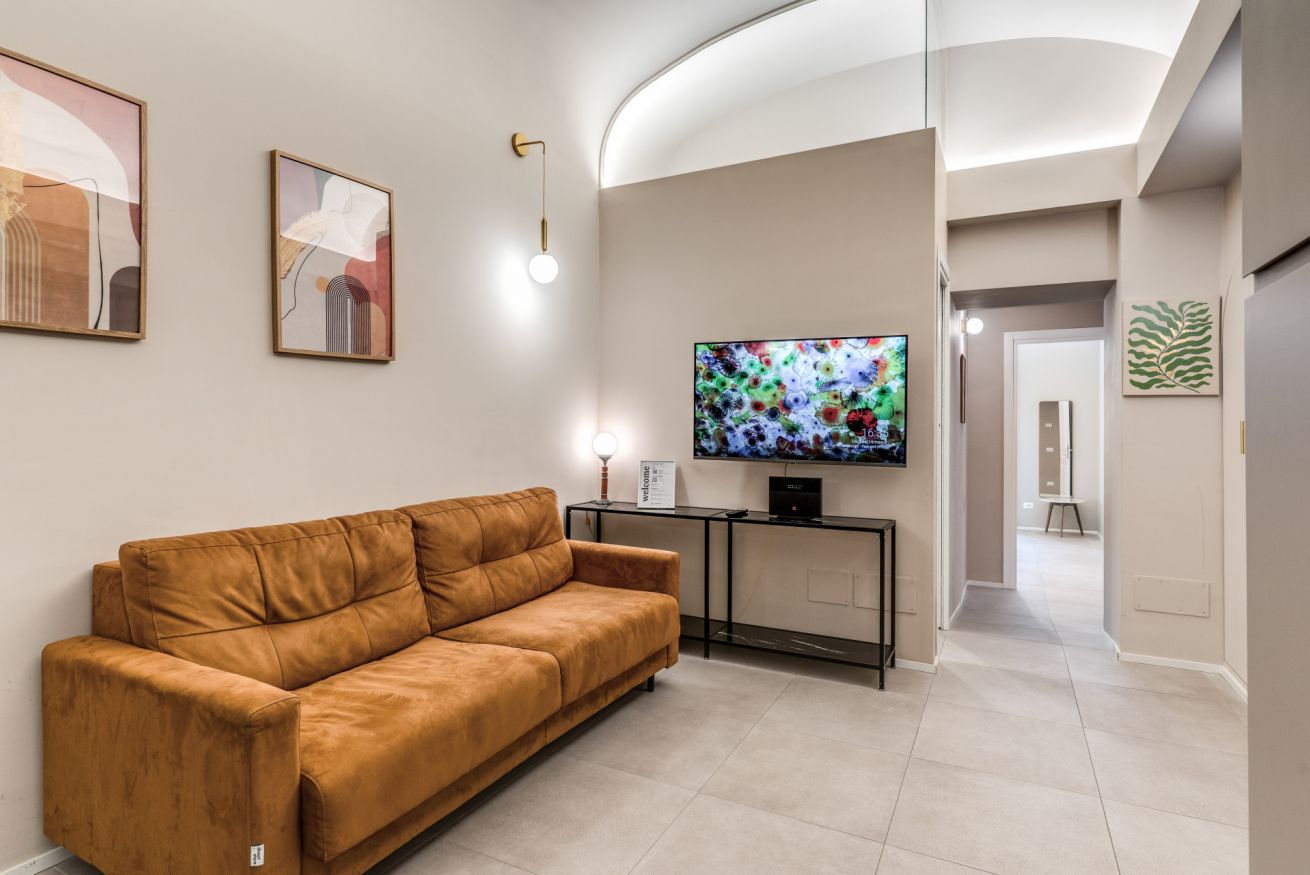 Una zona living con divano e cucina attrezzata completa questo appartamento, dotato di tutti i comfort e ideale per coppie, famiglie, gruppi di amici e reso unico dalla sua posizione strategica e servita da tutti i mezzi pubblici.