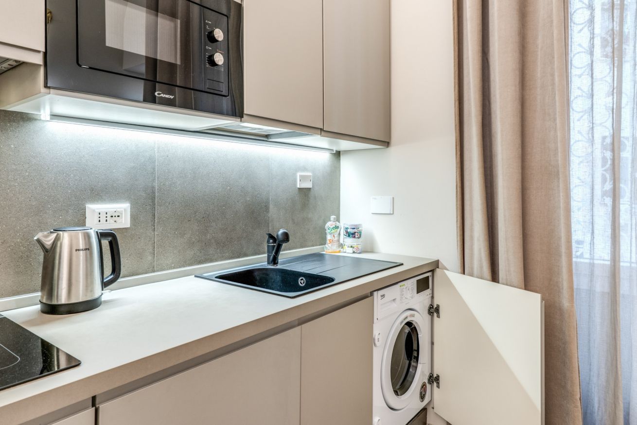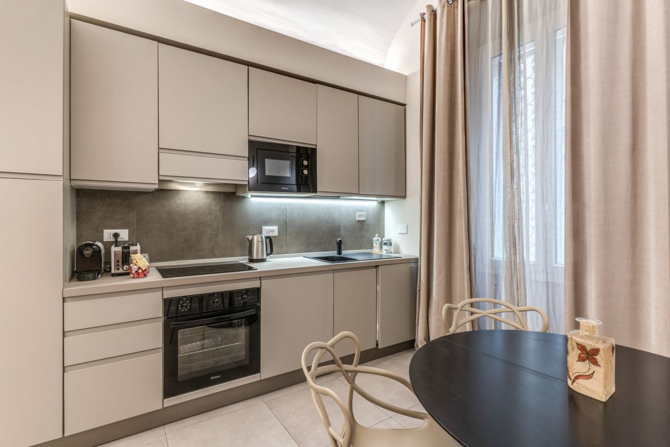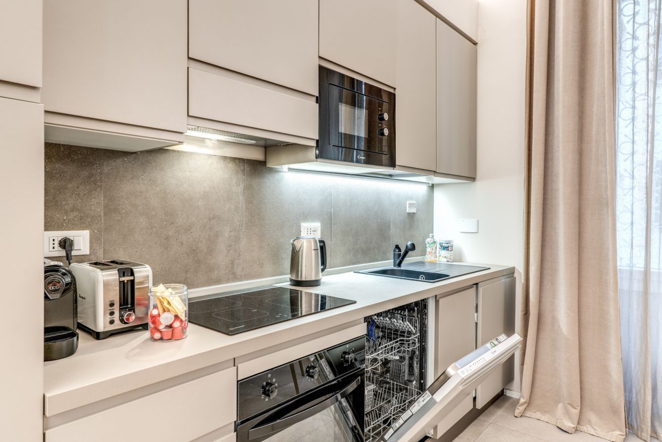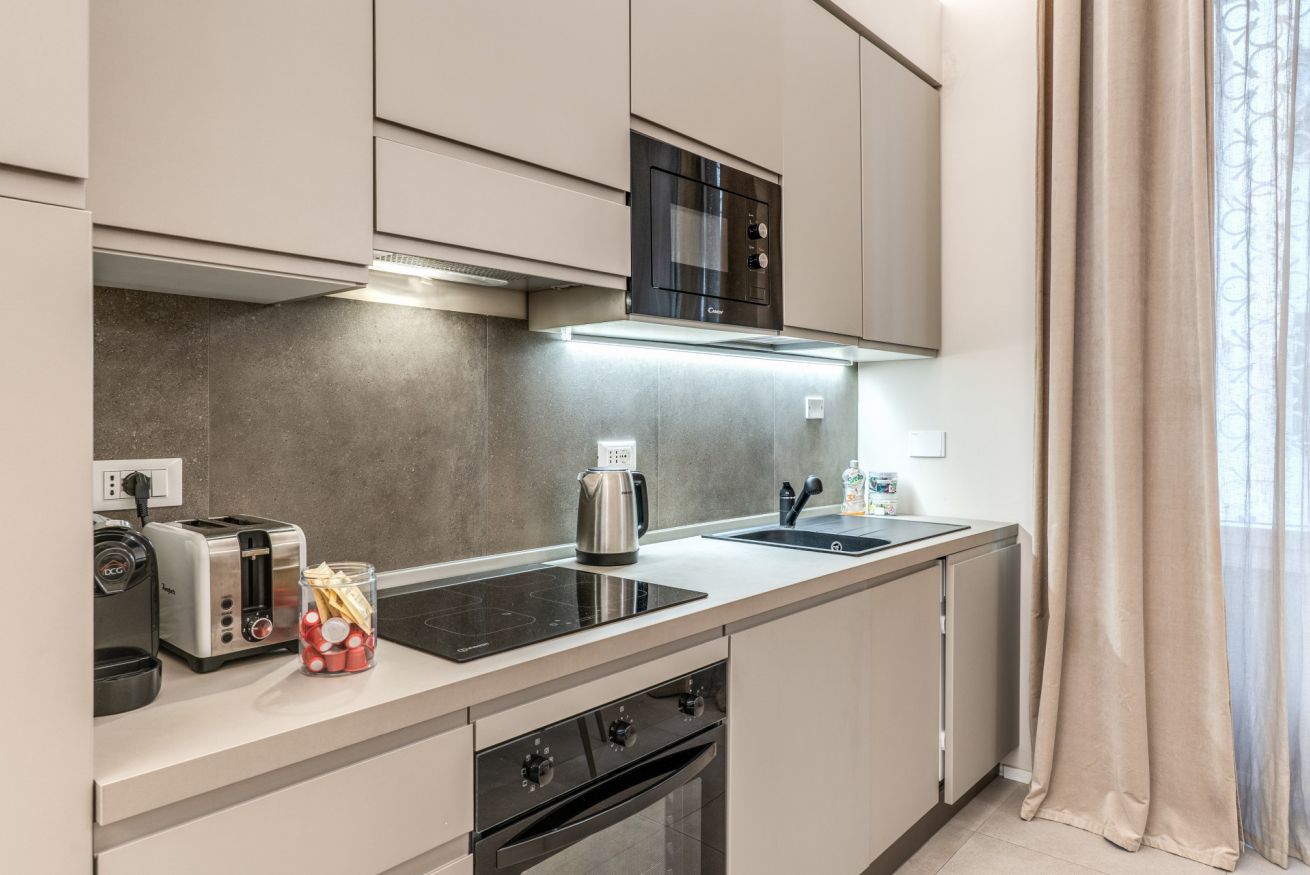 Una zona living con divano e cucina attrezzata completa questo appartamento, dotato di tutti i comfort e ideale per coppie, famiglie, gruppi di amici e reso unico dalla sua posizione strategica e servita da tutti i mezzi pubblici.