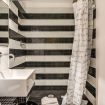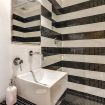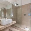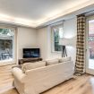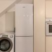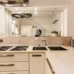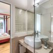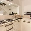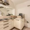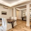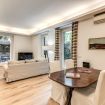 L'appartamento offre una zona giorno spaziosa con tavolo da pranzo e area relax, una cucina completamente attrezzata, una camera matrimoniale con bagno en-suite, una camera singola e un secondo bagno completo.